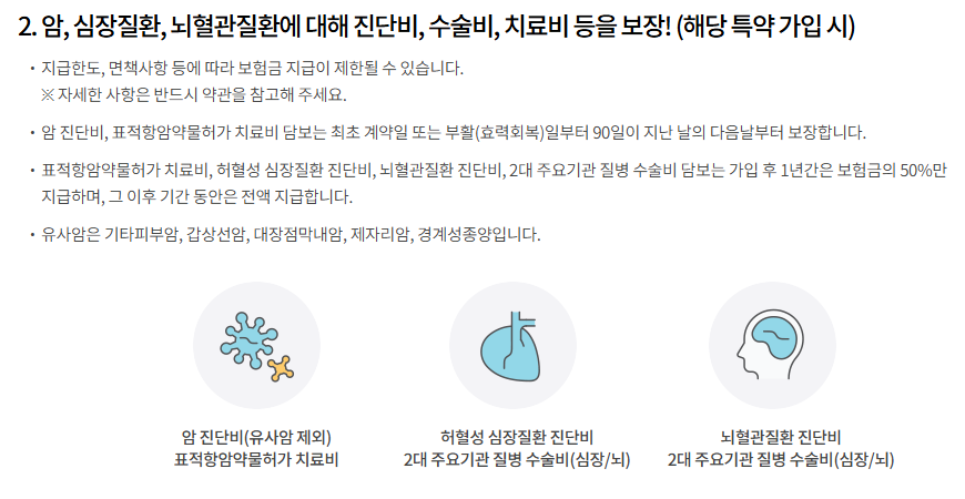 - 진단비와 수술비: 암, 심장질환, 뇌혈관질환 등 주요 질병에 대한 진단비와 수술비를 보장합니다.